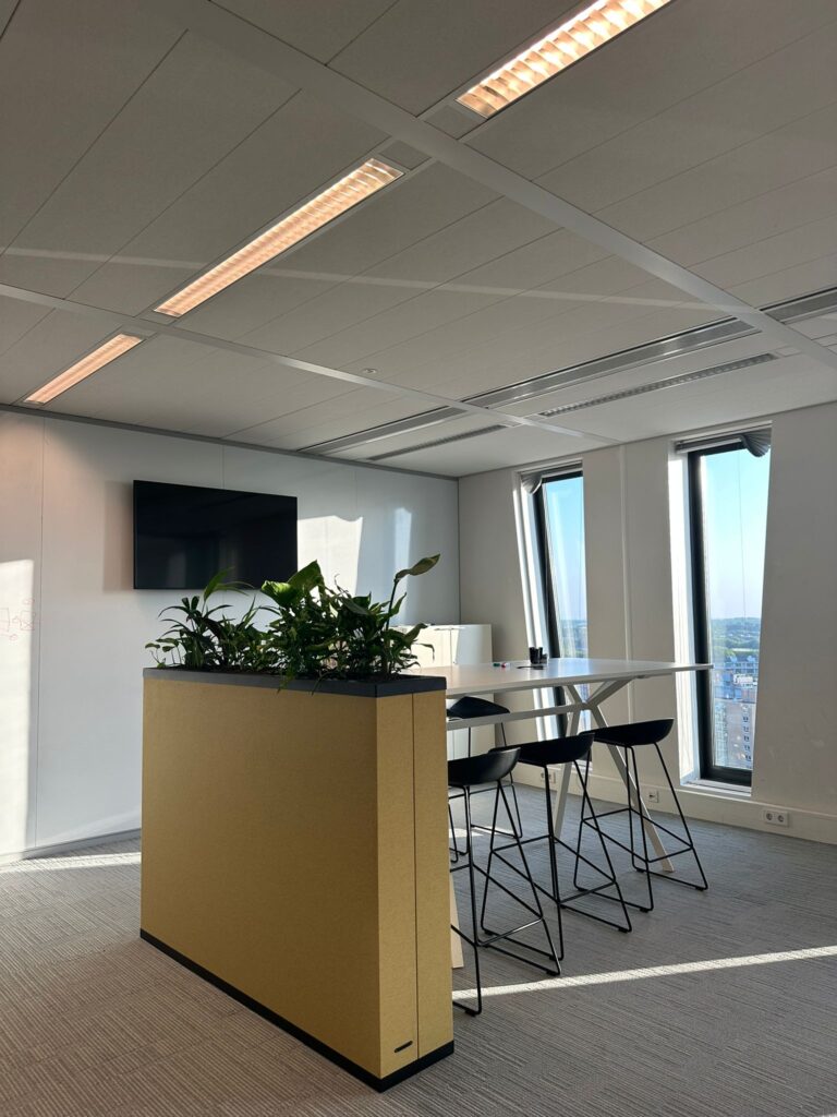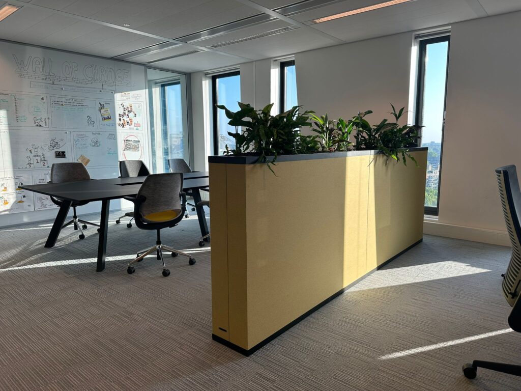 We kozen voor circulaire oplossingen: plantenbakken van oude bureaubladen en bureaustoelen van 100% gerecycled PET ♻️.